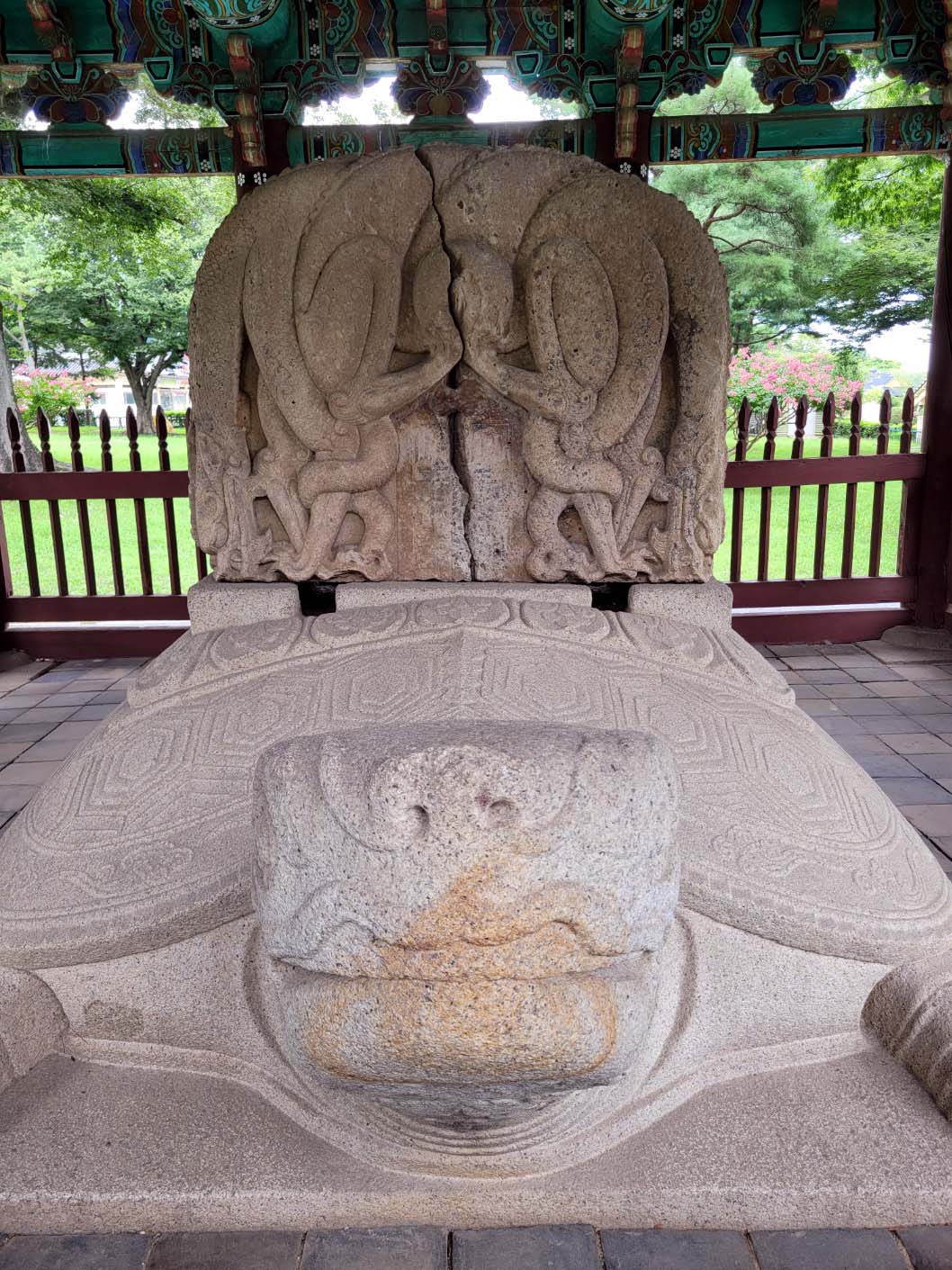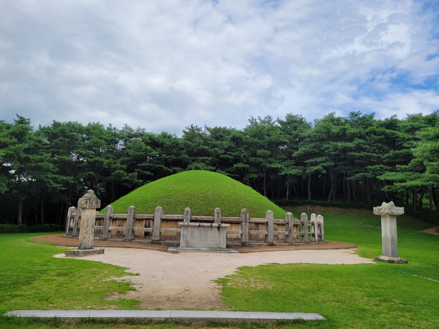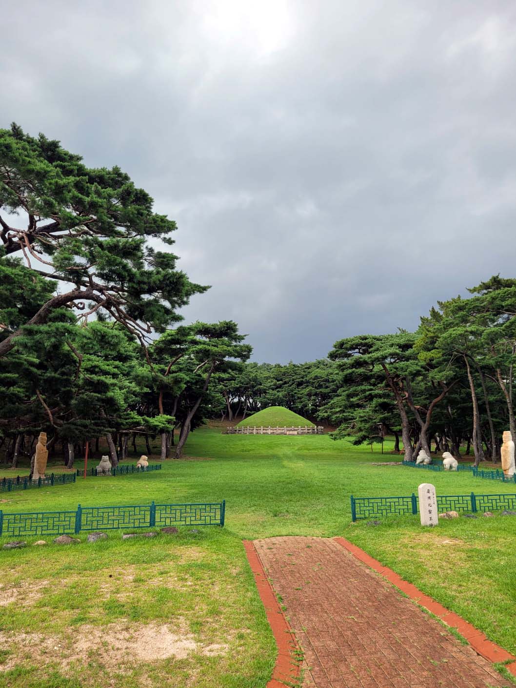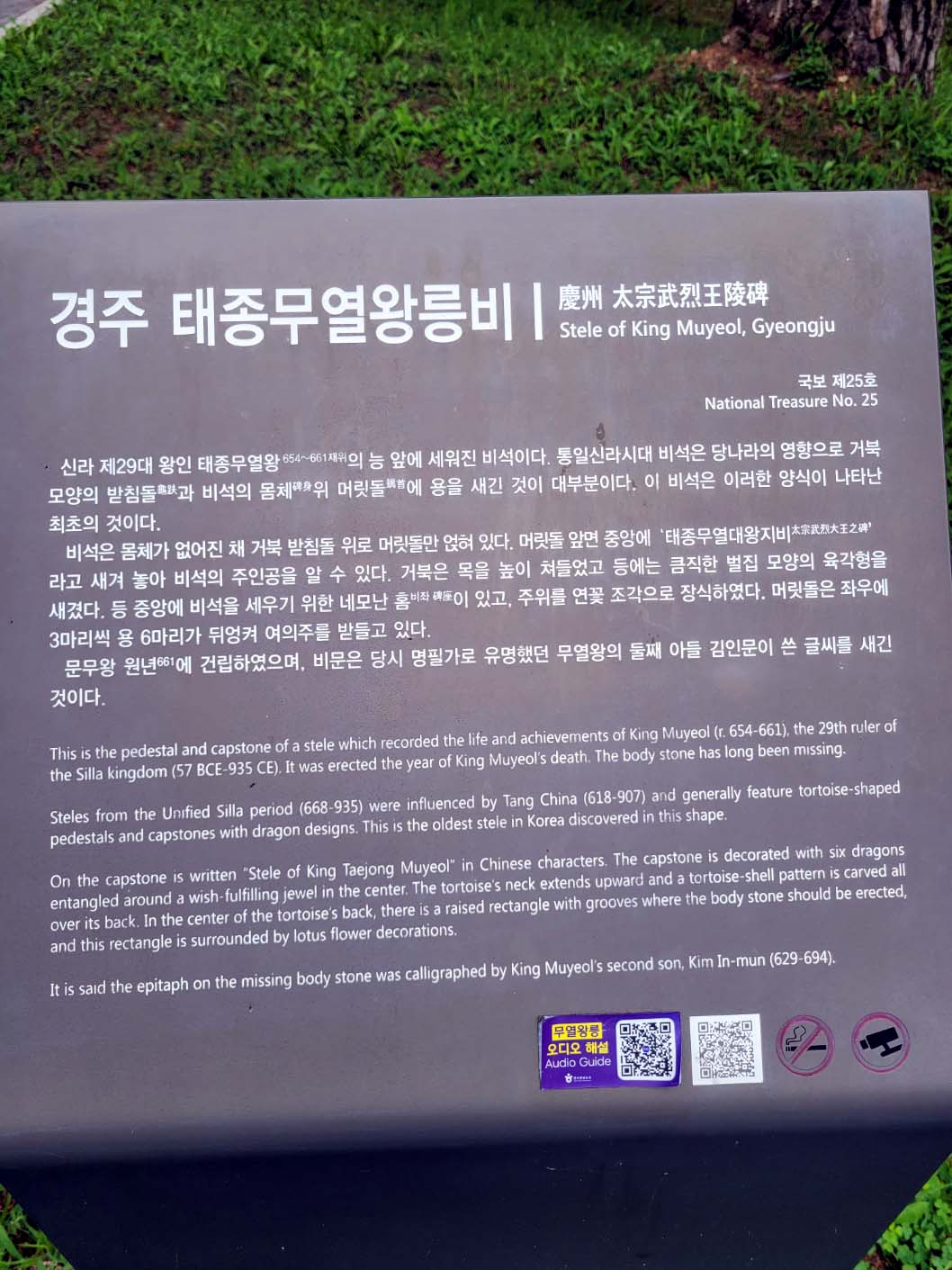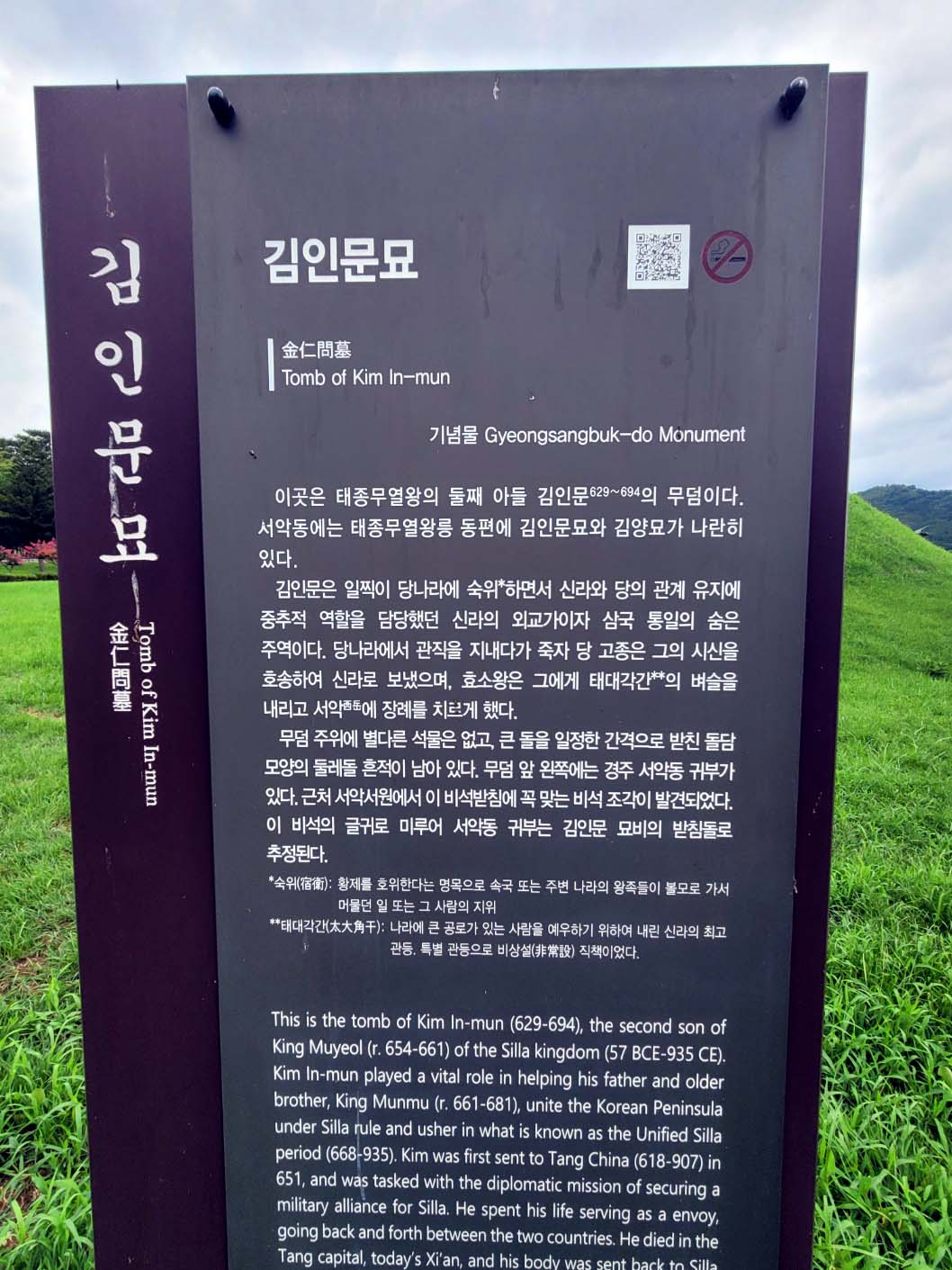 아름드리 소나무 숲으로 둘러싸여 안온하게 자리 잡은 왕릉과 碑身은 없고 몸통을 받혔던 龜趺(거북모양의 받침돌) 위에 머릿돌(이수)가 얹혀있는 국보 25호인 武烈王陵碑를 구경한 후 왕릉 건너편에 있는 김인문(무열왕의 아들)의 묘로 간다.
