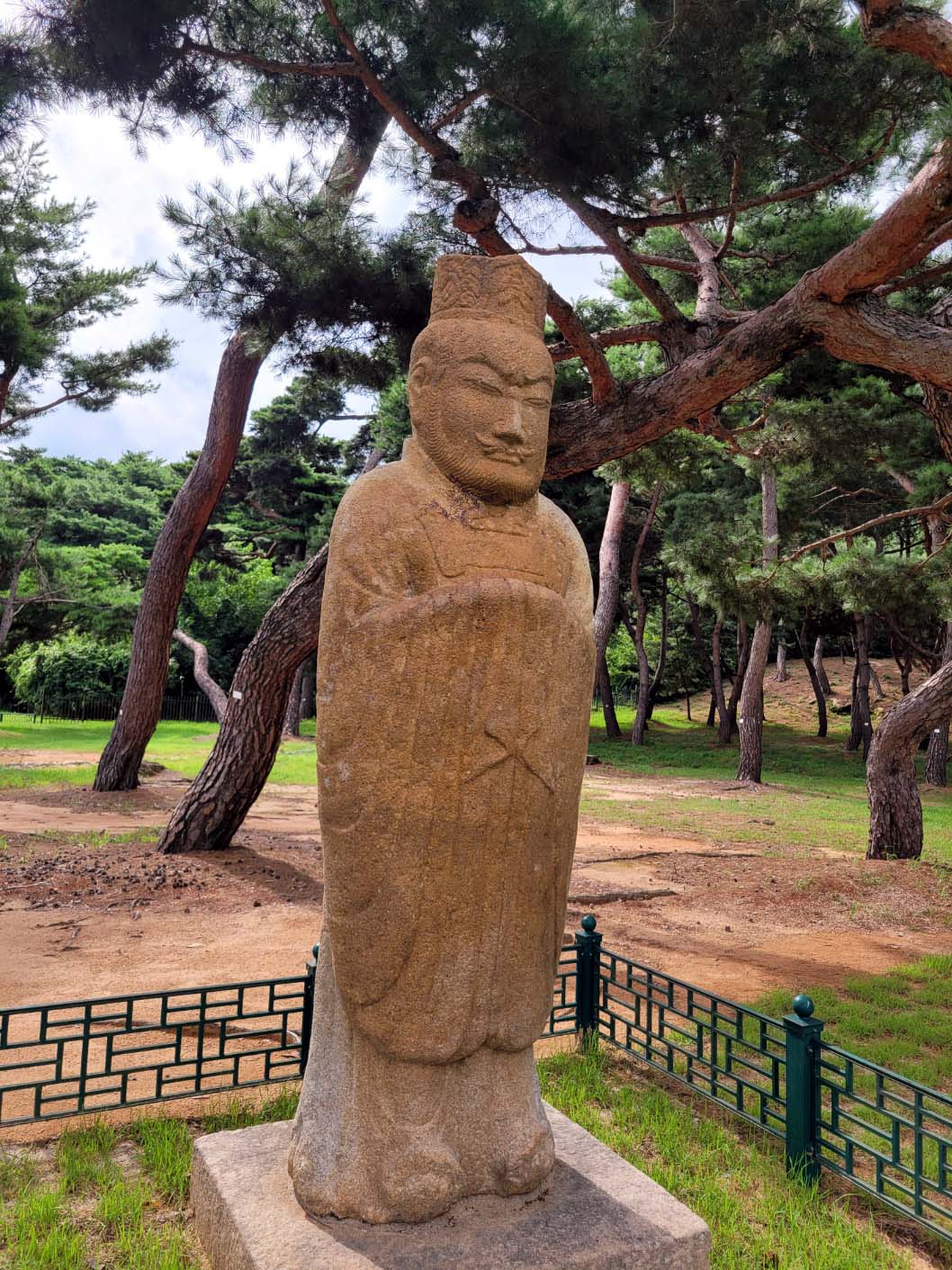특히 아라비아인 모습인 무인석은 안강읍 육통리에 있는 흥덕왕릉의 무인석과 흡사하다. 그러고 보니 신라 말기 38대 원성왕과 그의 손자인 42대 흥덕왕(원성왕의 손자이며 41대 헌덕왕의 아우)의 왕릉은 닮은 점이 너무 많다, 이상하게도 흥덕왕릉 주위의 굽은 소나무와 원성왕릉 주위의 굽은 소나무가 너무나 흡사하다.