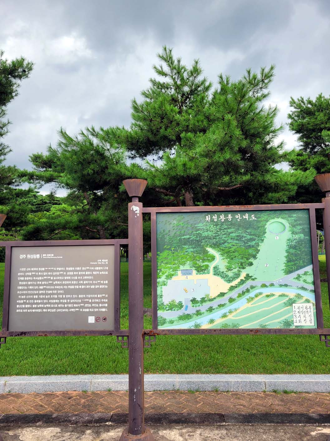 김인문 묘를 보고 무열왕릉정류장에서 300-1번 버스를 타서 중앙시장 앞에서 내려 600번 버스로 환승하여 괘릉입구에서 내려 원성왕릉(괘릉)에 갔다. 불국사역에서 울산방면으로 가다가 影池입구를 조금 지나면 나오는 자그마한 야산 자락에 있는 원성왕릉은 주위가 온통 소나무 숲으로 둘러싸여 있고 십이지신상의 봉분과 돌 난관 울타리로 되어 있으며 다른 왕릉과는 다르게 입구에 마주보고 서있는 보물로 지정되어 있는 석물(좌표석, 문인석, 무인석, 돌사자석상)이 특징이다.