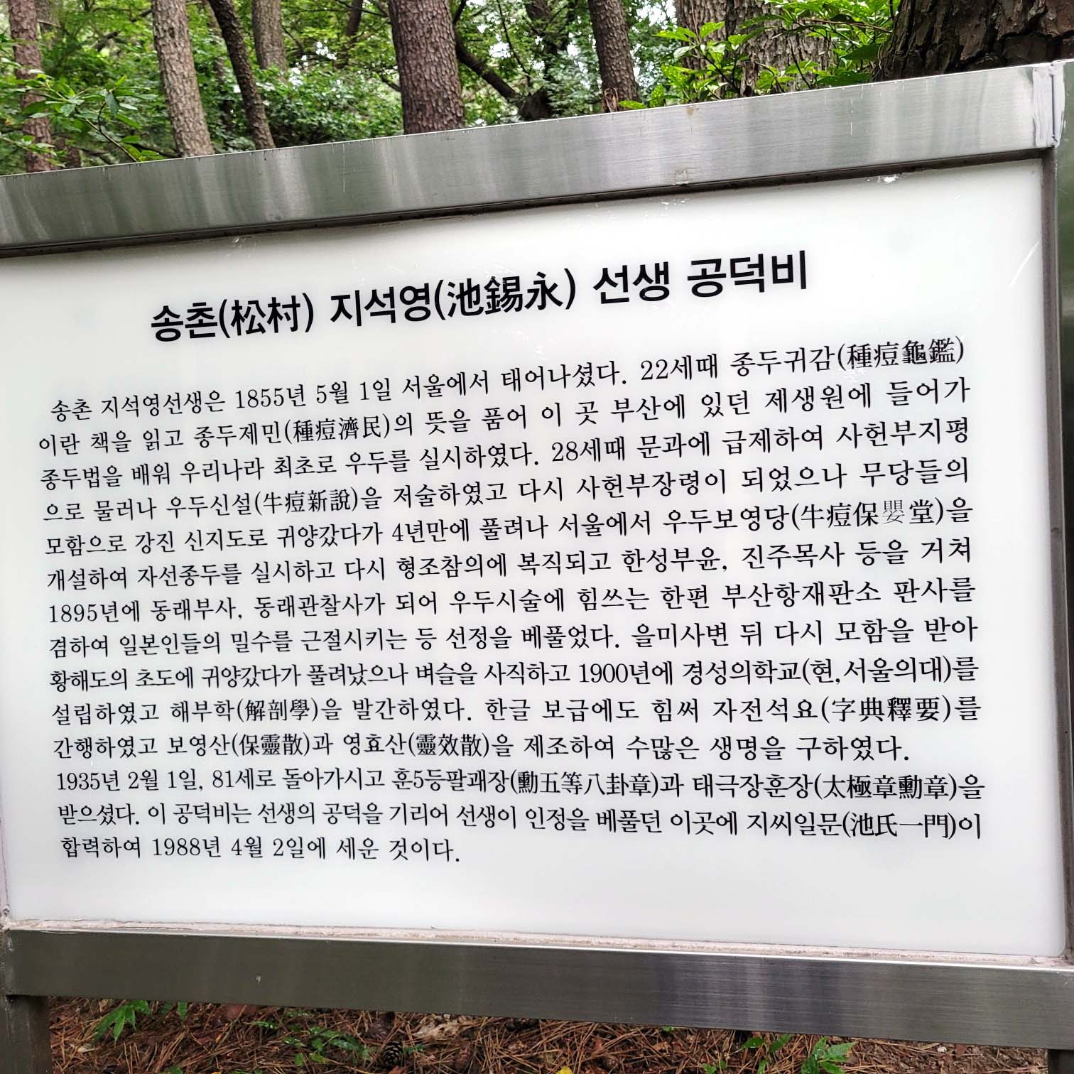 역사책에서 본 처음으로 종두법을 시행한 지석영 선생의 공덕비