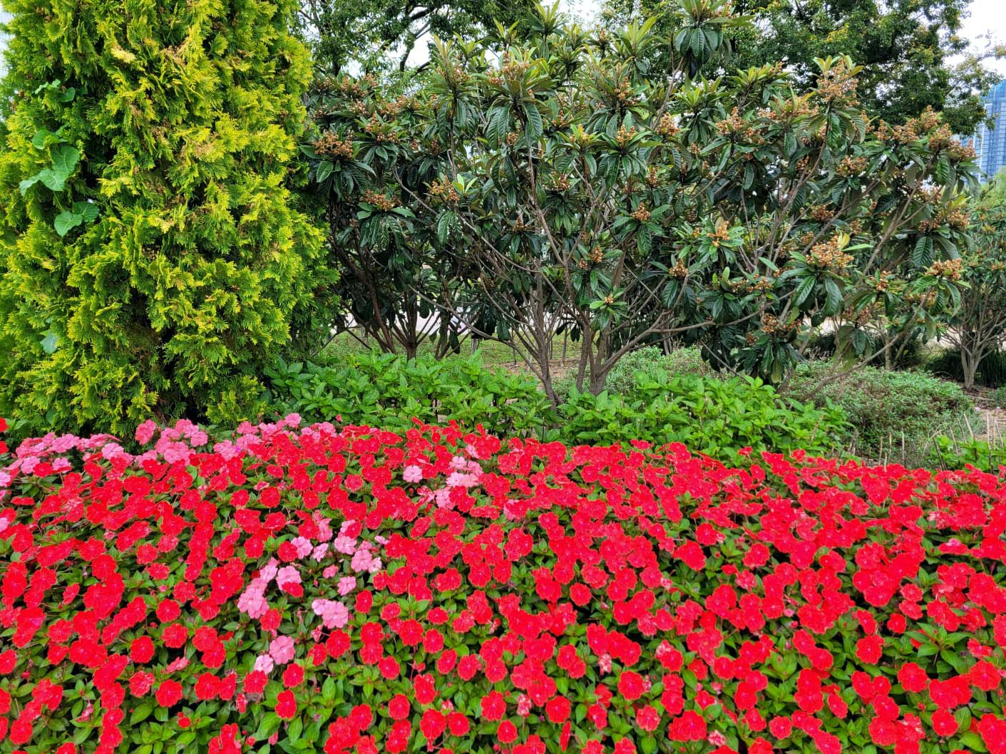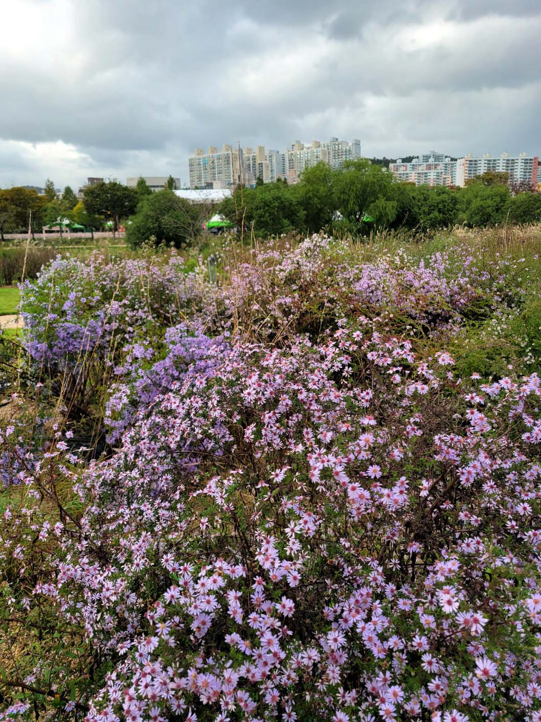 조금 덜 핀 노지 국화, 코스모스와 황화 코스모스, 핑크 뮬리, 팜파스 그라스 등 등.
