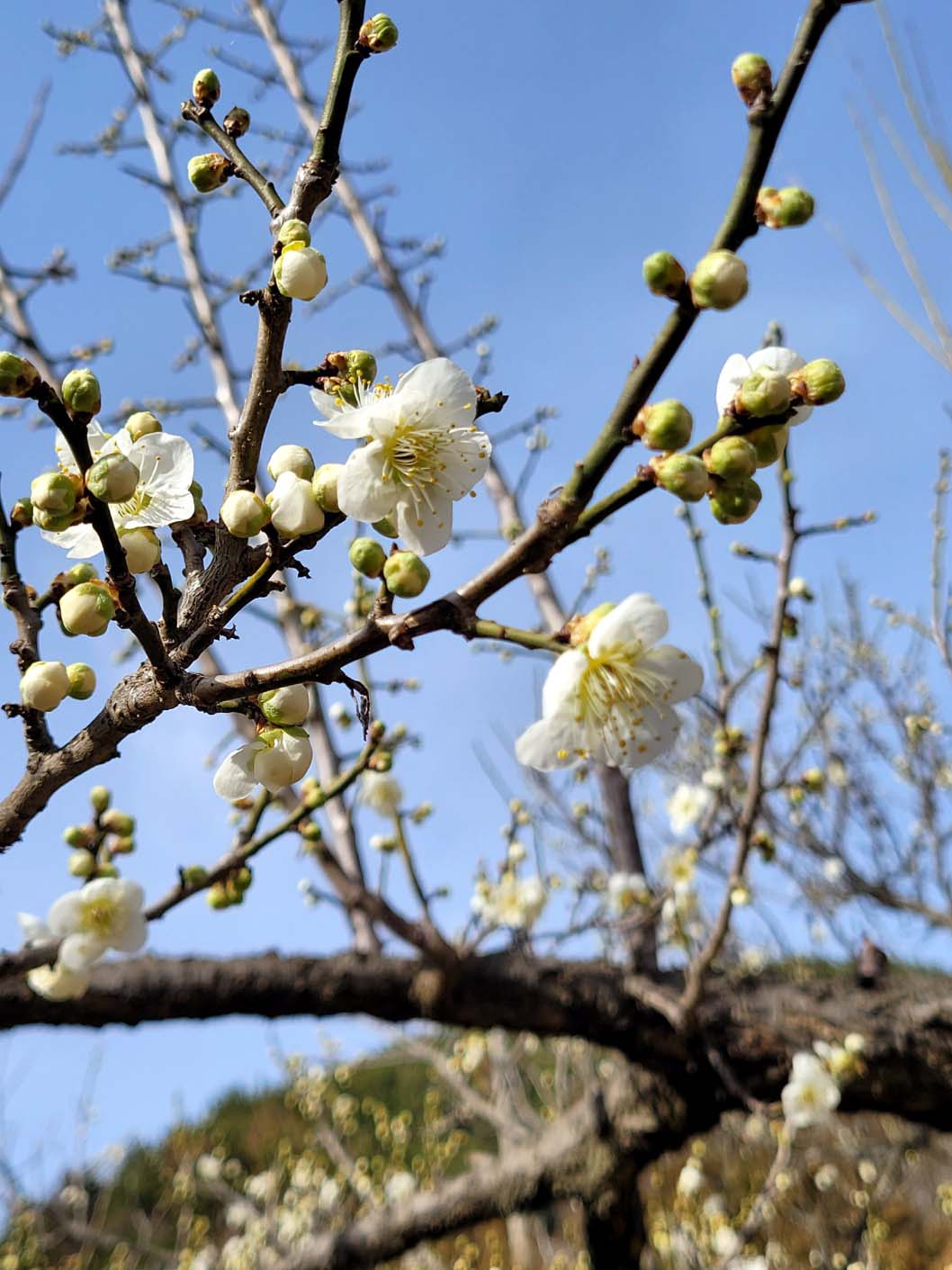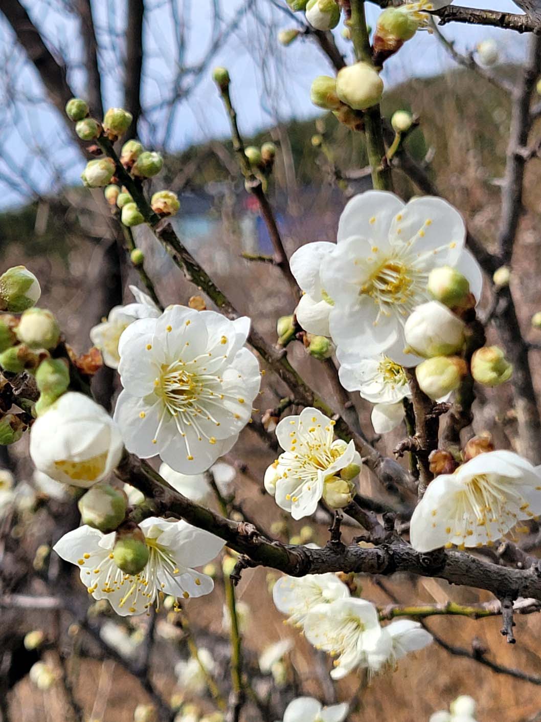 여기는 양지바른 산비탈이 많아 원동에서 가장 일찍 꽃이 핀다. 봄이라고 하기에는 너무 이른 지난 2월 21일, 찬바람이 옷깃을 파고드는 겨울인데도 이곳에는 도로 옆 양지바른 비탈에 드문드문 꽃을 달고 있는 백매나무와 꽃잎을 터트리기 직전 붉는 꽃망울을 주렁주렁 달고 있는 홍매나무가 너무 예뻐 사진을 찍었다. 뒤에는 출렁이는 낙동강물이 보이고.
