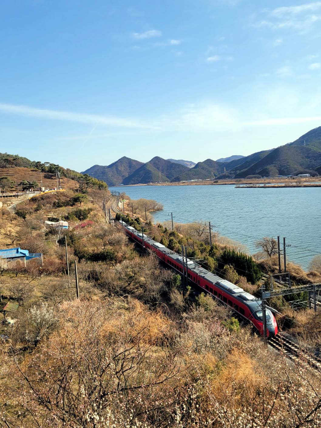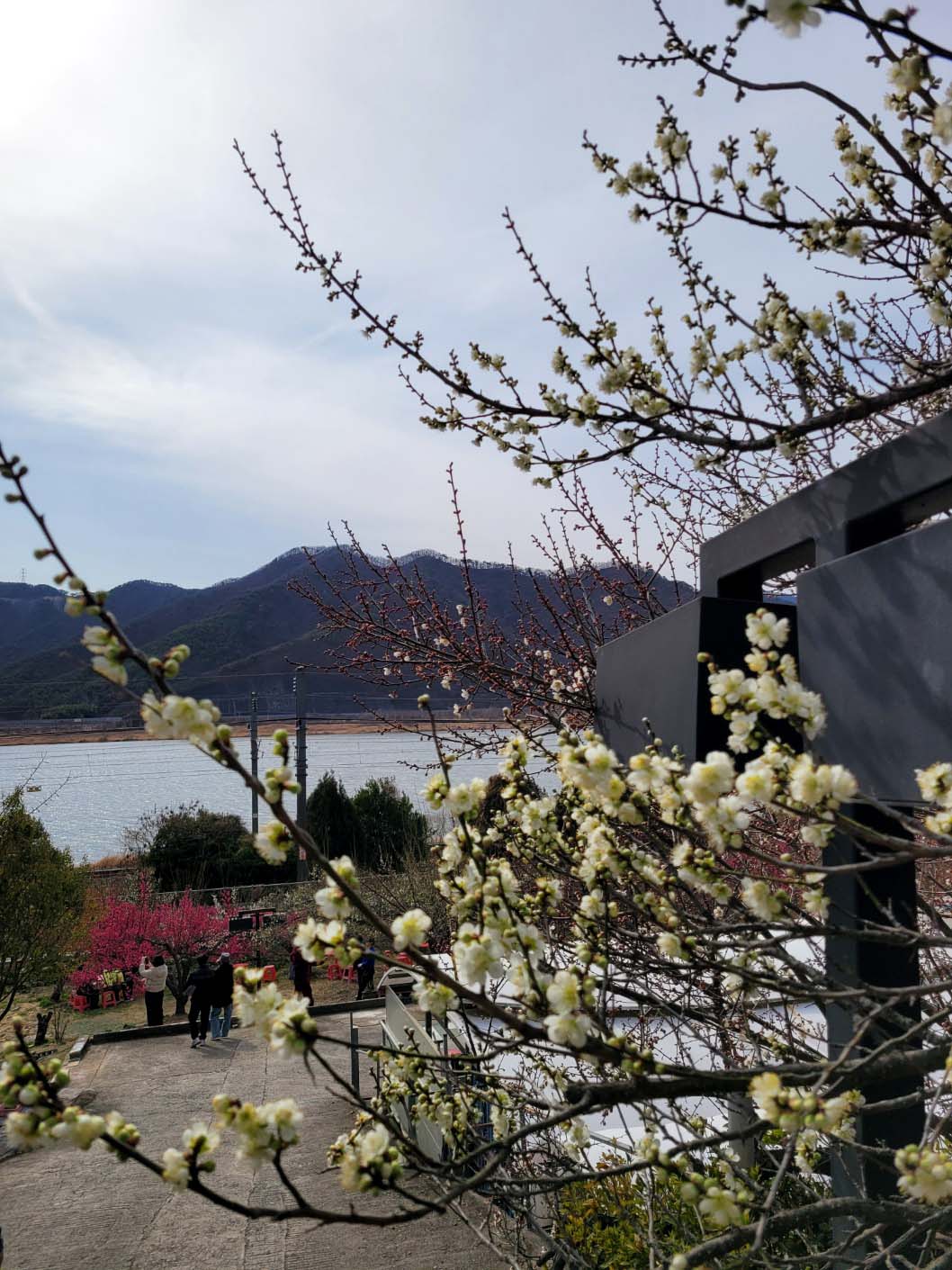 순매원의 홍매는 이미 만개하였고 여기에도 백매와 청매는 예쁜 꽃망울만 가지에 맺혀있었다. 국수 한그릇을 사 먹고 이리저리 꽃 구경을 하다가 도로에 올라와 멀리 보이는 원산을 배경으로 푸른 낙동강과 순매원, 기차길 위를 달리는 ktx 열차를 한 컷 촬영했다. 이렇게 매화의 계절도 속절없이 가고 있다.
