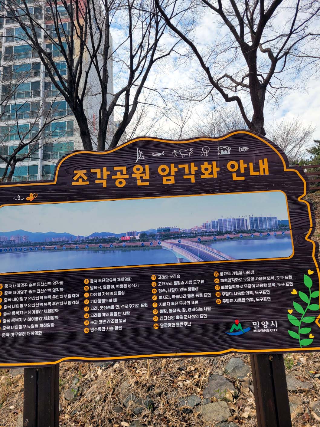 * 구포역(12:16, ITX) - 밀양역 - 용궁사로 가는 지하도 - 용궁사 - 용두산 생태통로 - 용두산 생태통로 힐링산책로(금시당수변길) - 금시당(되돌아 나와) - 수변산책로(잔도) - 용두목(징검다리) - 삼문 송림 - 암각화 조각공원